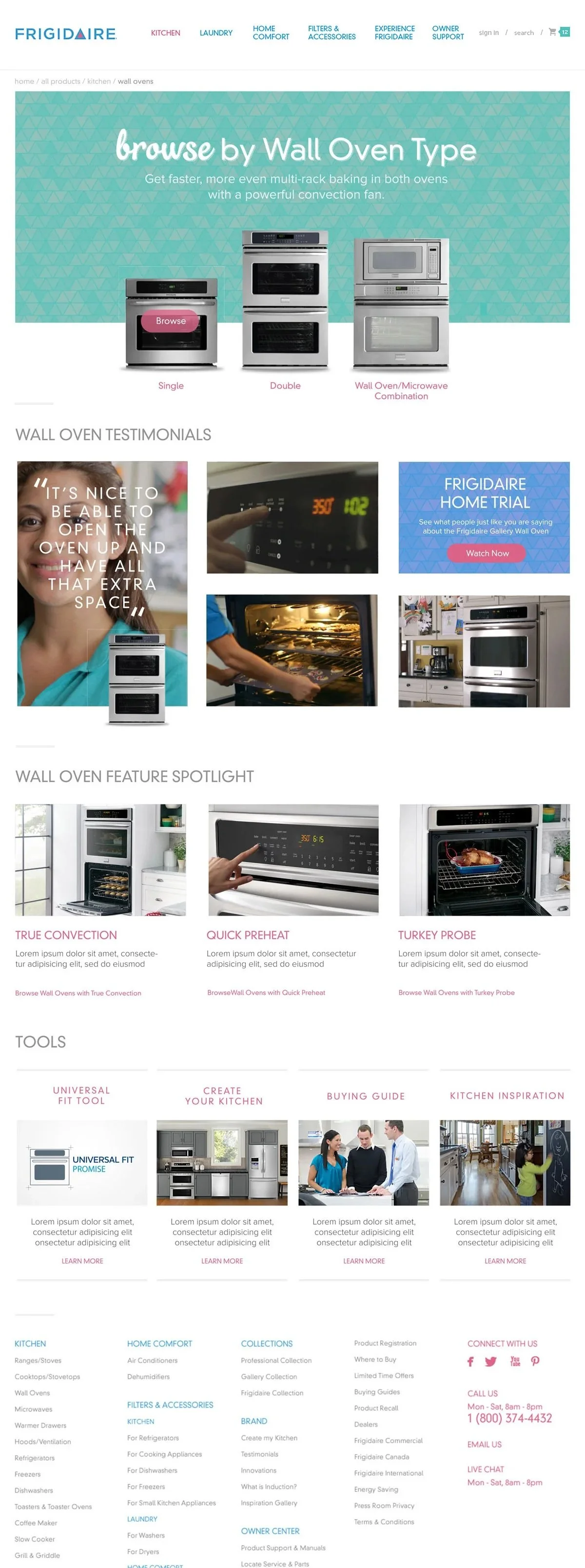 Frigidaire needed a more intuitive way for consumers to shop across a wide range of appliances. The redesigned eCommerce platform simplified browsing and comparison with a clear taxonomy, product filters, and smarter navigation. Responsive layouts and lifestyle imagery brought clarity and warmth to the brand, turning a technical shopping task into an approachable digital experience. The website serves as a hub where users can explore product lines, access manuals, and find inspiration for their homes.